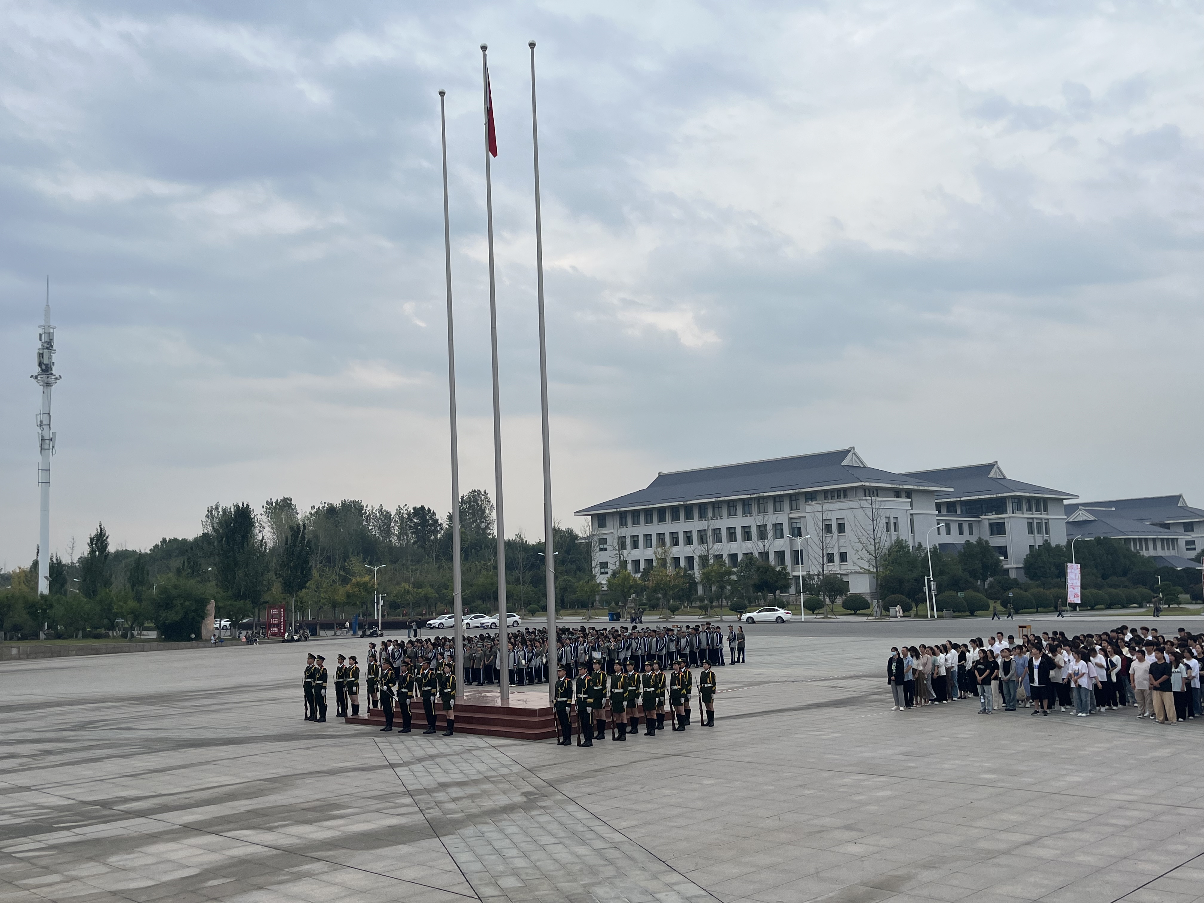 早上7时整,国旗护卫队迈着铿锵有力、整齐划一的步伐护送五星红旗,伴随着《义勇军进行曲》奏响,鲜艳的五星红旗在清晨的微风中冉冉升起,全场肃穆,行注目礼。在庄严的气氛中,全体师生共同追忆历史,缅怀先烈。