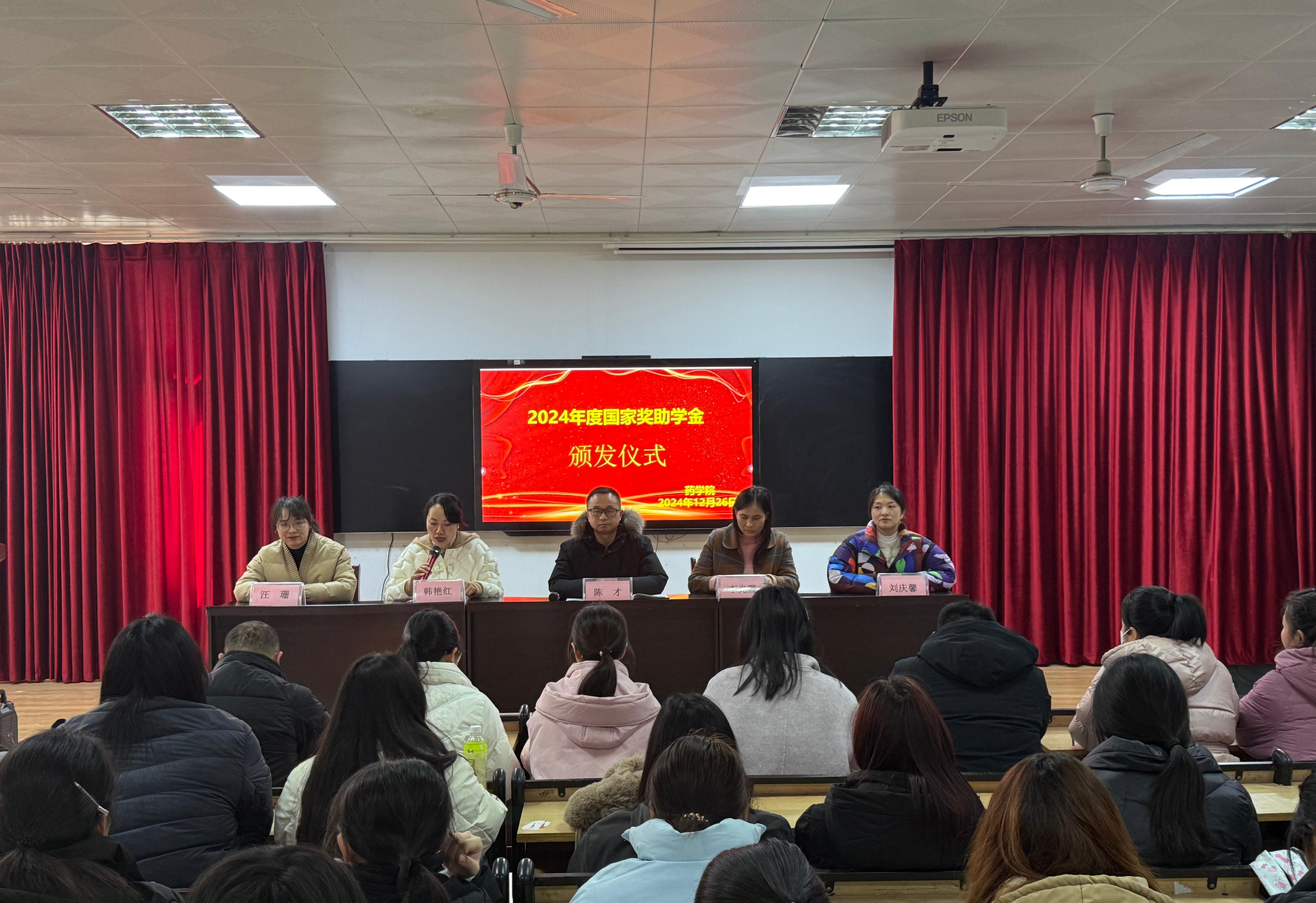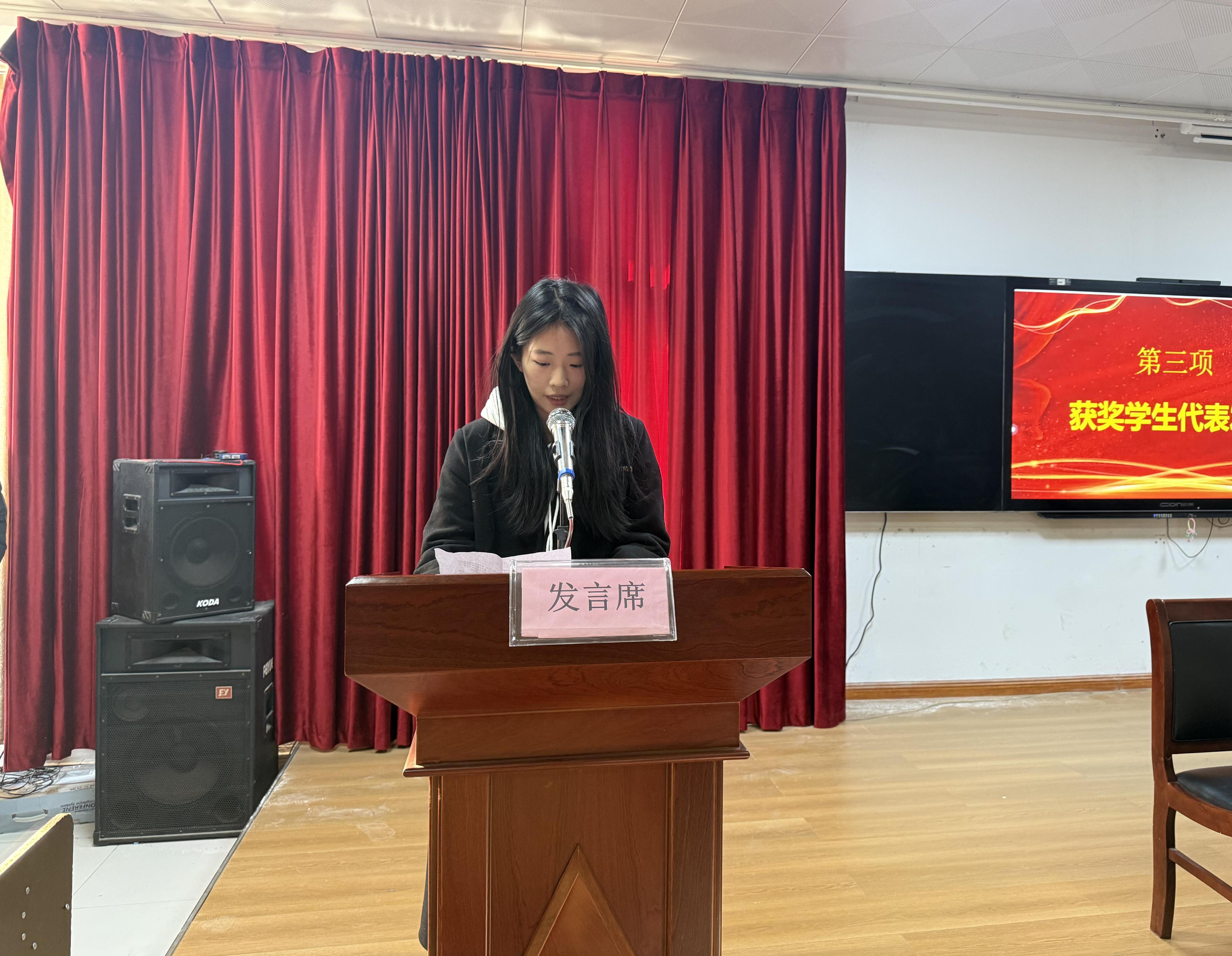 接着,2024年度国家奖学金获得者22级药学4班的郭思驿、国家励志奖学金获得者23级药学2班的张艺、国家助学金获得者24级药学3班的毛瑞莹作为获奖学生代表依次上台发言。她们在发言中深情表达了对国家和学校的感激,并承诺将这份关爱转化为前进的动力,努力学习,回馈社会。