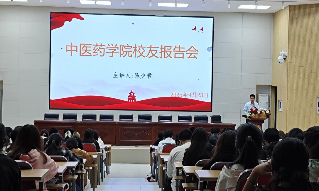 为充分发挥优秀校友的榜样引领作用,引导学生科学规划学业与职业发展,2025年9月28日晚,中医澳门十大网投平台排行在医学院行知讲堂隆重举行校友大讲堂活动。活动特邀学院2015届药学专业优秀毕业生、现就职于平舆县市场监督管理局的陈少君校友重返母校,为学子们带来一场精彩纷呈的分享会。中医澳门十大网投平台排行党总支书记陈才、副书记李光霞出席活动,学院24级、25级各班学生代表300余人共同聆听了本次讲座。