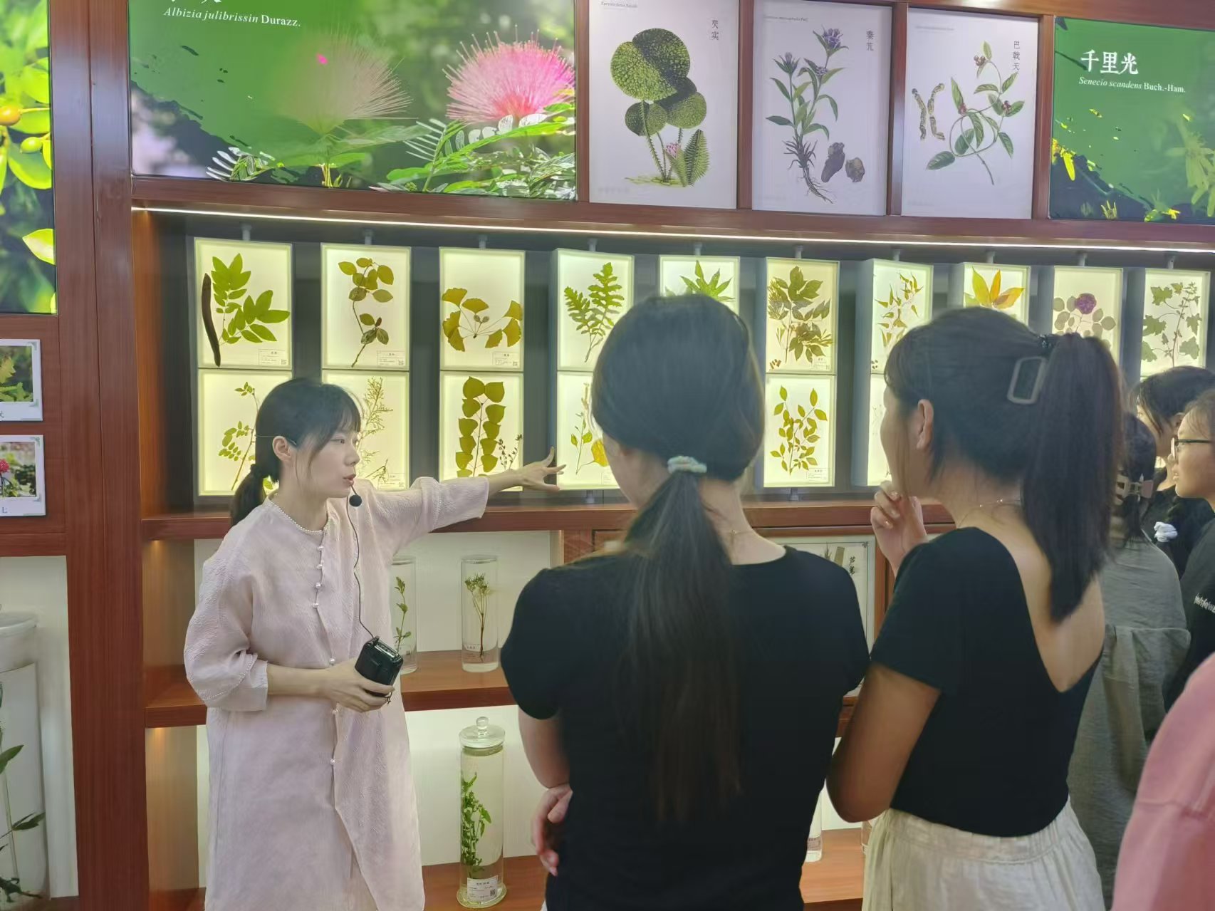 以班级为单位,同学们在讲解员绘声绘色的介绍中走进了科技馆外的长廊,晏青山、高梦研讲解员分别与大家分享了《屠呦呦与青蒿素》、《孙思邈与悬丝诊脉》的故事。展厅内主要分为7个模块,每一个模块的讲解员都给同学们带来不一样的惊喜,在大别山特色厅,讲解员结合投影互动沙盘和360°全息技术展示了大别山的特色药材,使同学们了解到大别山道地药材的各期生长形态。在浸制、腊叶标本厅,讲解员鼓励同学们在VR和AR区体验河南道地药材的采集过程。同学们对丰富多样的中药标本及科技项目的体验赞叹不已,纷纷表示亲自接触和观察中药材,切身体会到了中医药文化的博大精深。